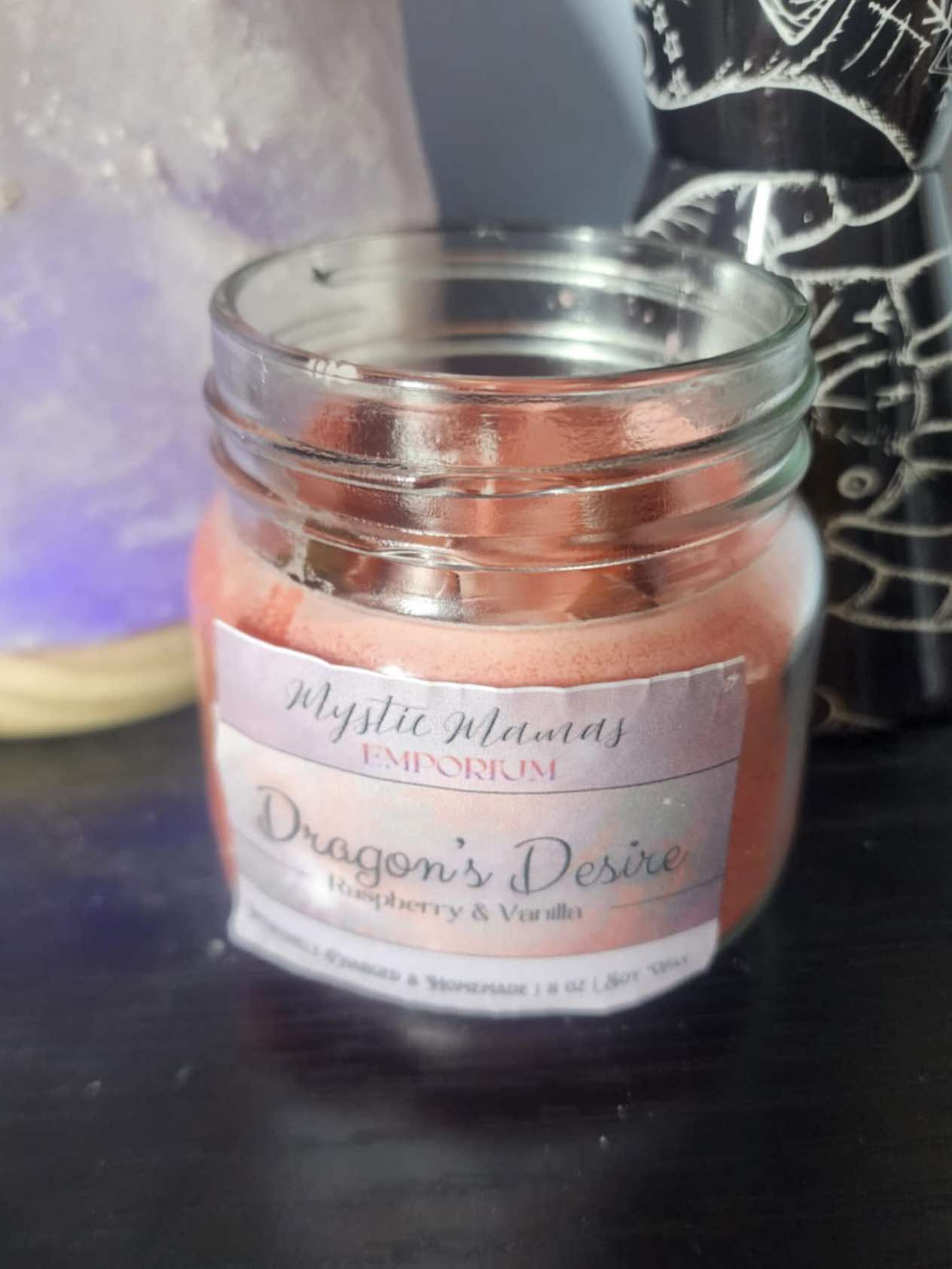 8oz soy wax candle with notes of black raspberry and vanilla and red jasper chip stones on top.