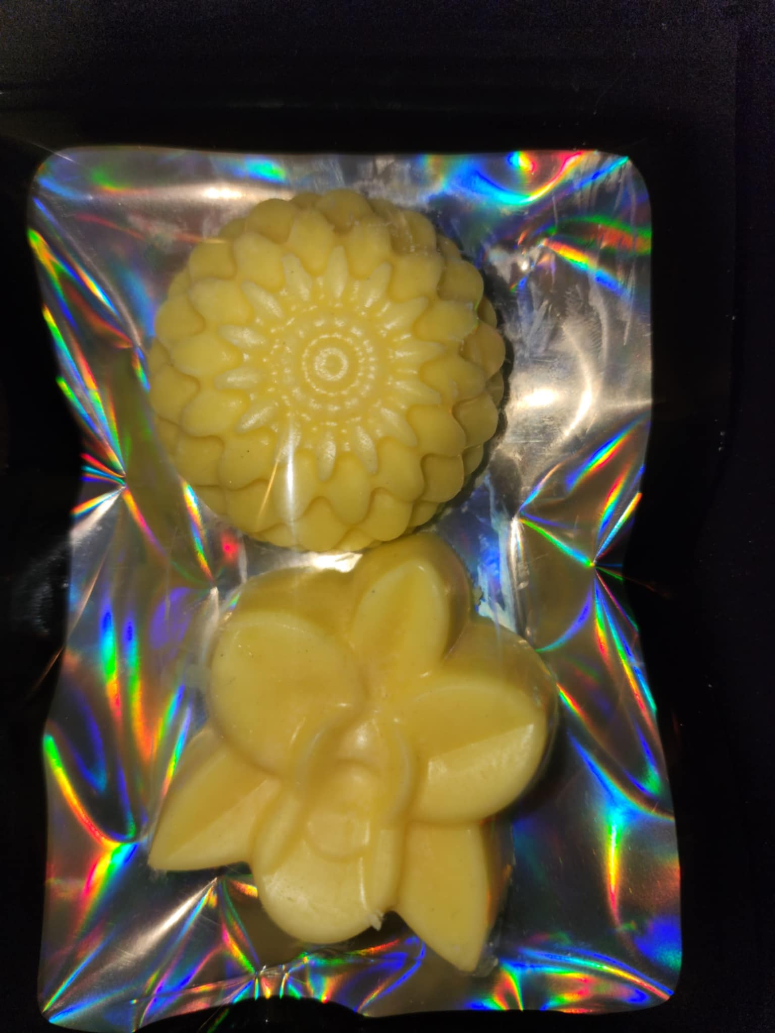 Limited edition. 2-Pack Flower shaped jumbo wax melts made from pure soy wax. Banana and strawberry lemon sorbet scented. You can break these apart or keep as is! Melt and enjoy:)